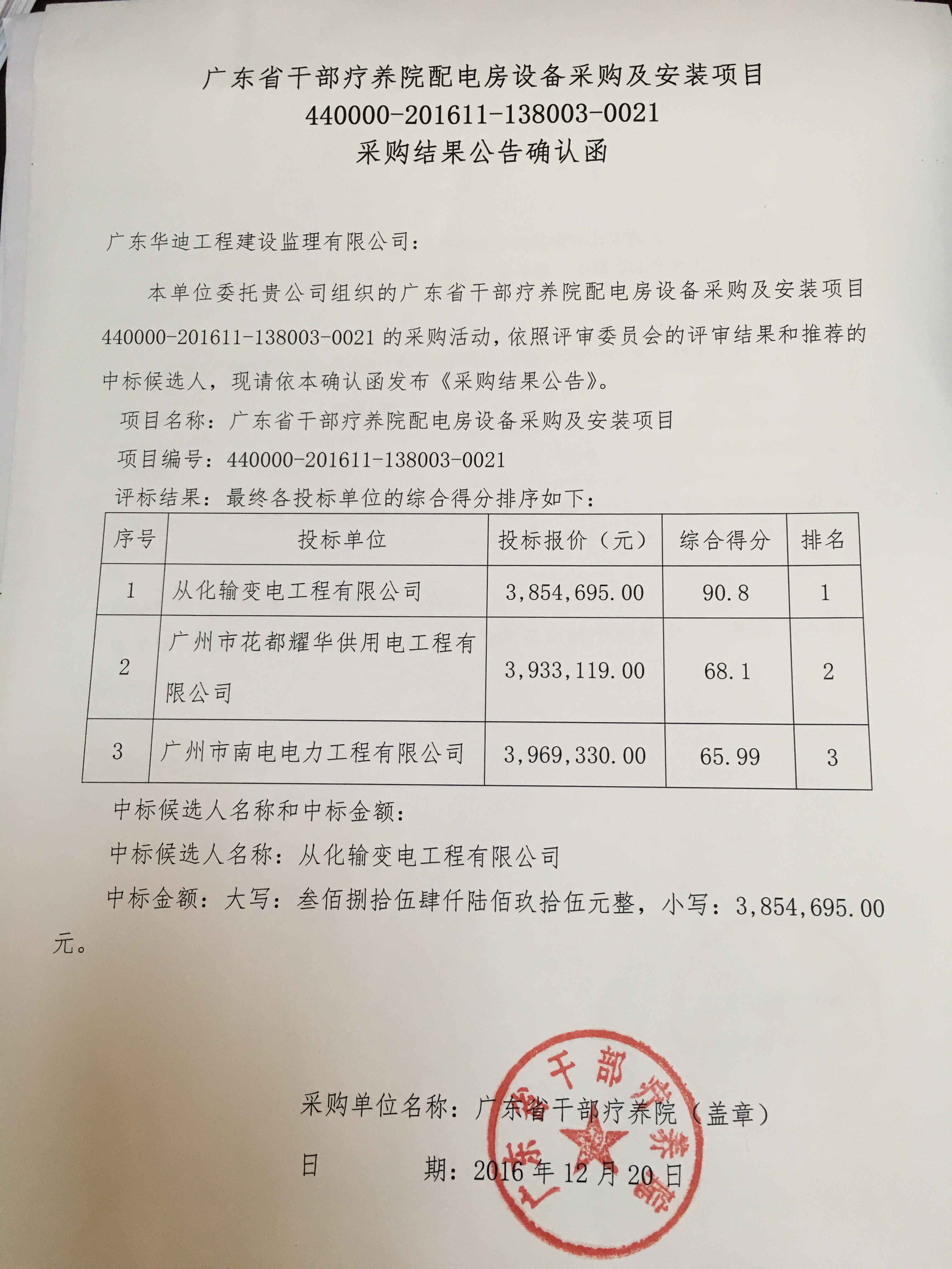 廣東省干部療養(yǎng)院配電房設(shè)備采購及安裝項(xiàng)目采購結(jié)果公示